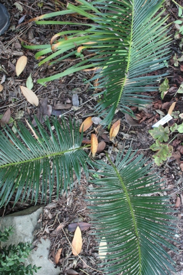 Cycas panzhihuaensis is a rare cycad that hails from China's southern Sichuan and northern Yunnan provinces, where it was discovered and named in 1979. Its natural habitat consists of dry, scrubby, wooded slopes where it grows in alkaline soils. Its native location makes it one of the most cold hardy cycad species. In our trials so far, the leaves are burned back at temperatures below 12 degrees F, but they return nicely in spring. When mature, Cycas panzhihuaensis will develop a 6' tall trunk topped with a ring of stiff "fronds" which emerge green when young but later change to glaucous.