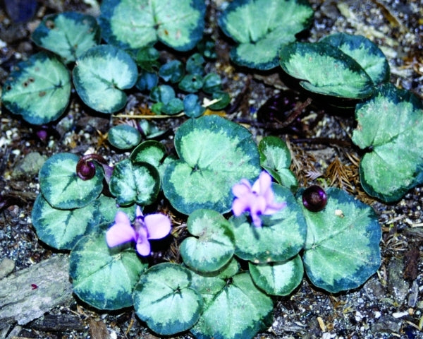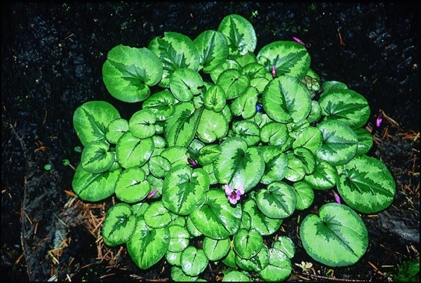 These exquisite little gems of the rock garden burst forth in late fall with small, rounded, quarter-sized leaves of black-green...occasionally patterned with dramatic silver markings. They are joined in late winter (February in NC) by the 2" tall flowers ranging from pink to purple. Be sure to mark the clumps, because at the onset of hot weather the entire clump goes dormant for the summer. Plant under the branches of a large tree or shrub to ensure that the corms stay dry in the summer. Cyclamen coum was named by the Royal Horticultural Society as one of the top 200 plants of the last 200 years!
