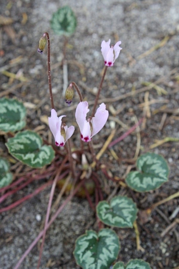 We love Cyclamen mirabile, not only for the charming pink flowers produced from September through December, but also for the highly ornamental silver dollar-sized foliage which is often intricately patterned in silver and green. Cyclamen mirabile has been particularly reliable for us, thriving under our largest eucalyptus tree which provides dappled shade and dry soil during summer while the bulb is resting. The 1", bright pink, nodding flowers are typical of the species, although the individual petals are often twisted. New foliage emerges in autumn and is sometimes flushed pink, aptly living up to its epithet "mirabile" which means marvelous!
