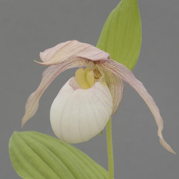 Cypripedium 'Francis' is a 2001 Owen Robinson release...a cross of the US native Cypripedium kentuckiense and the Asian native Cypripedium speciosum. Cypripedium 'Francis', named after Owen's dad, forms a 15" tall specimen, topped with medium-sized flowers with a white and purple stained pouch from the Cypripedium speciosum parent, and backed with long, twisted, purple striped sepals that show the influence of Cypripedium kentuckiense. As with all cypripedium, slightly moist but well-drained soils are best. Our offerings are all flowering-sized plants.