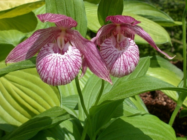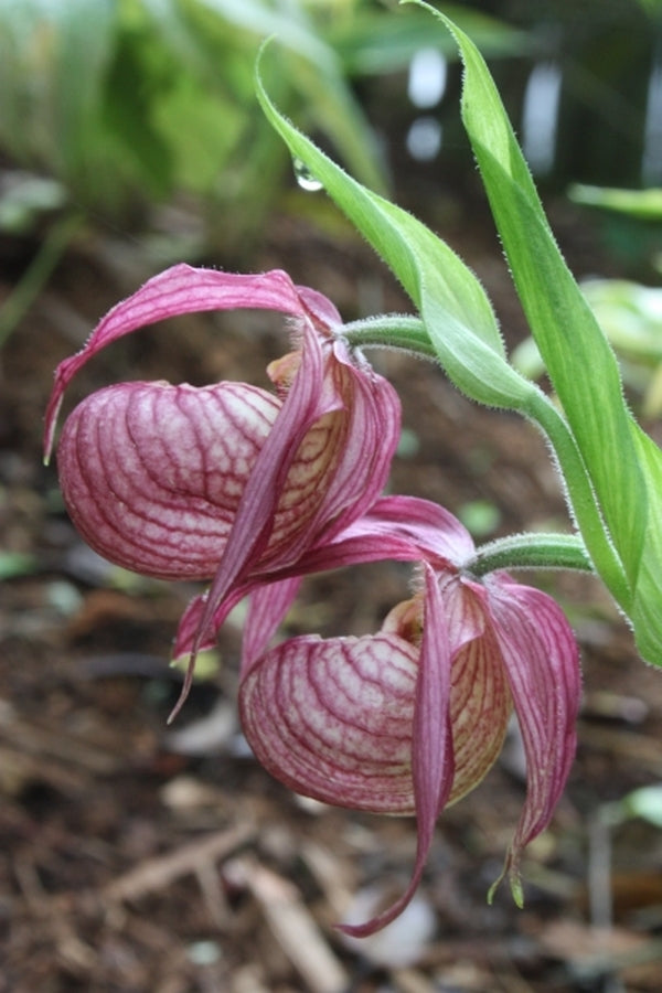 Cypripedium 'Michael', which is a 1998 Werner Frosch introduction, named for cypripedium grower Michael Weinert, has been one of our best garden performers in the heat and humidity, despite its reported preference for alkaline soils. Cypripedium 'Michael' is a small-growing hybrid created from a cross of two Chinese native species, Cypripedium henryi and Cypripedium macranthos. The 10-12" tall stalks, adorned with pleated green leaves, are topped in late spring with a stunning purple and white pouch, backed by three dramatically striped purple and white sepals. Our offerings are all nursery-propagated, flowering-sized plants.