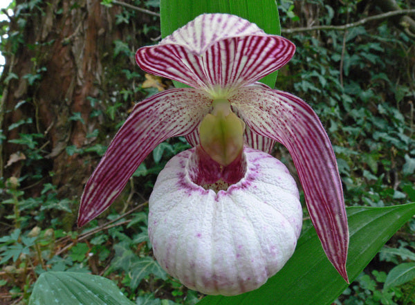 Cypripedium 'Monto' is a 2008 Hiratsuka hybrid that combines the genes of the high elevation Japanese Cypripediuim macranthos var. hotei-atsumorianum and endangered Chinese Cypripedium fasciolatum. The sturdy 18" tall stems are topped with flowers composed of a very large white pouch, often suffused with violet, and backed by lovely violet and white veined sepals. All of our ladyslipper orchids are flowering-sized plants and nursery propagated.