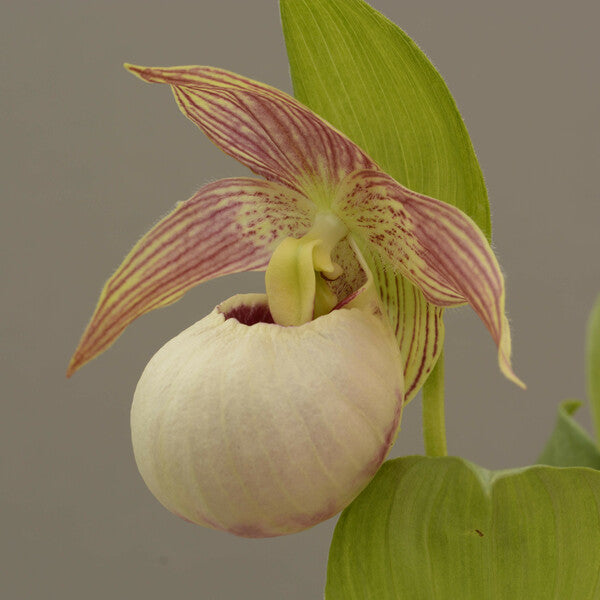 Cypripedium 'Tilman' is a 2005 Werner Frosch hybrid of the Chinese Cypripedium tibeticum and Cypripedium fasciolatum. Cypripedium 'Tilman' forms a 16" tall clump, topped with flowers composed of a large white pouch, backed by violet and white striped tepals. All of our ladyslipper orchid offerings are flowering sized plants.