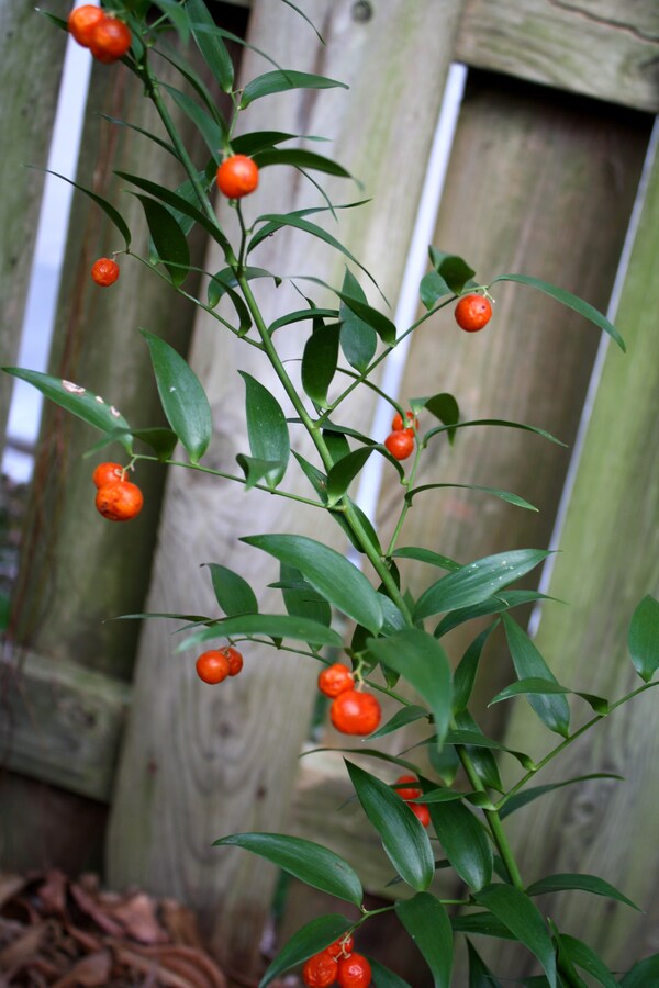 From Iran and other nearby Middle Eastern countries comes one of our favorite garden plants, Danae racemosa. The highly coveted poet's laurel will never be found at Wal-Mart...due to its slow speed of propagation. From seed, danae takes 5-7 years to become a sellable plant! Prized by florists and gardeners alike, the 4' long green stems that arch outward from a central clump, are clothed with thick waxy-green leaves that remain evergreen all winter. After establishment, poet's laurel clumps are laden with marble-sized reddish-orange ornamental berries in fall...incredibly easy, durable, and drought-tolerant for even the deepest of shady areas! In Greek mythology, Danae was the daughter of King Acrisius of Argos.