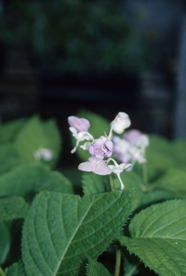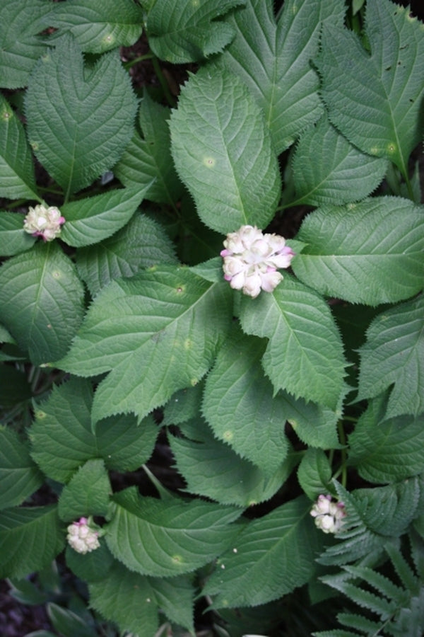 Deinanthe bifida is a bizarre hydrangea relative that hails from the mountain woodlands of Japan, where it forms a 2' tall x 2' wide clump of rough-textured, bi-lobed, light green leaves. The clumps are topped in June (NC) with white flowers resembling miniature hydrangea florets. The leaves can be cooked and eaten, but we prefer spinach. Deinanthe bifida is about as esoteric as it gets, so this plant is not going to get gobbled up by the Wal-Mart marigold and impatiens crowd. If this is your thing, be sure to jump on the esoteric bandwagon before they're all gone...they're really cute.