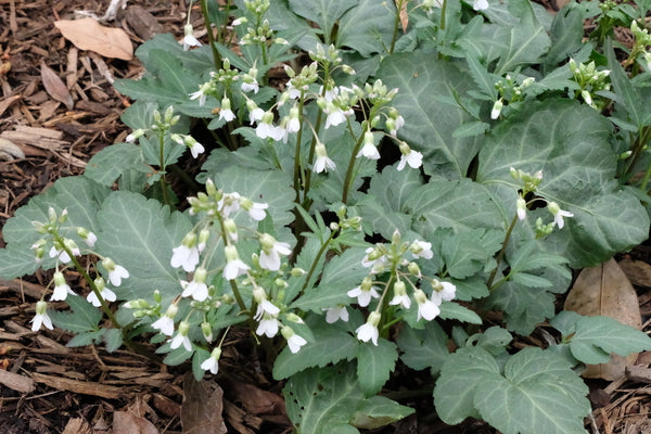 (aka: Cardamine 'Come Pewter') Dentaria 'Come Pewter' is a 2022 Plant Delights/JLBG introduction of a hybrid toothwort, which we think is a cross between two Eastern US natives, Dentaria diphylla and Dentaria heterophylla. Dentaria 'Come Pewter' emerges in early February (NC) with mitt-shaped pewter-silver foliage that forms a 4" tall x 15" wide clump. The 5" tall stalks of white bell-shaped flowers top the clump, starting for us in late February. Average to rich woodland soils are best. The perennial dentarias are spring ephemerals, usually going to sleep by May.