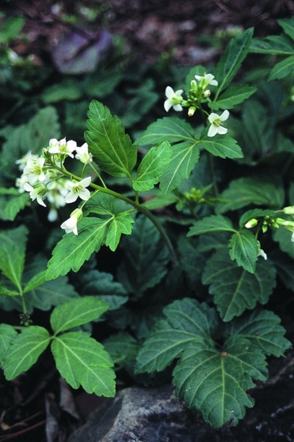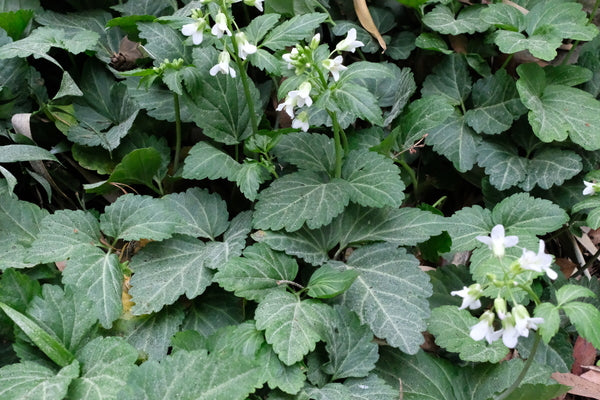 (aka: Cardamine diphylla) Dentaria diphylla 'Supermax' is a 2007 Plant Delights/JLBG introduction of a recently renamed large-leaf selection of the Eastern US (Maine to Mississippi) native toothwort with the largest foliage we've seen in the species. Each three-parted leaf measures 7" long/wide, compared to a typical 3.5" long x 4.5" wide leaf. We originally acquired our plant from garden writer Pam Harper as Dentaria maxima, which it turned out not to be. We've grown this amazing selection since 1996, in which time, it's made a thick 5' wide, weed-suppressing woodland groundcover. Dentaria 'Supermax' goes summer dormant, re-emerging in late fall/early winter. The patch of tripartite dark green leaves, adorned with muted silver veining is topped with 10" stalks, terminating in clusters of white bells in early-mid April (NC). Light shade and average to moist soils (acidic or alkaline) are preferred.