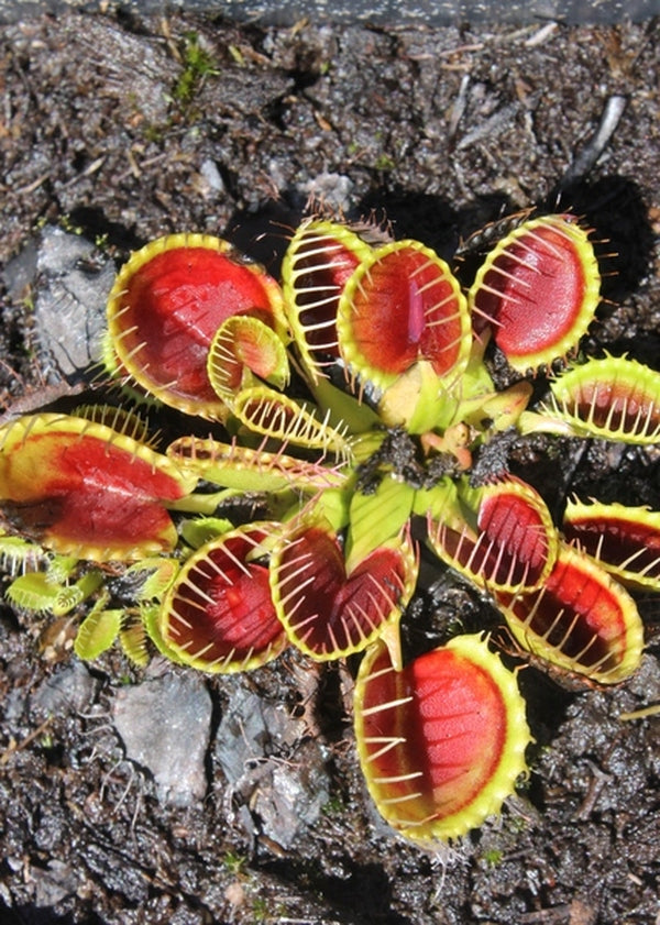 (aka: Dionaea 'Cup Trap') Dionaea 'Cupped Trap' is a most unusual form of our native Venus fly trap, that occurred as a tissue culture mutation at Florida's Agristarts III lab. The name Dionaea 'Cupped Trap' was subsequently registered by Florida's Steven Stuart in 2003. The bright red-centered traps are fused on the top end, causing the traps to form more of a rounded cup than normal, although this mutation has no effect on its insect catching ability. This odd mutation also offsets much faster than normal and subsequently the individual plantlets never get very large. Because of its small size, Dionaea 'Cupped Trap' is best grown in a container of straight peat moss that's kept moist from the bottom, although it's certainly as winter hardy as the straight Venus fly trap species.
