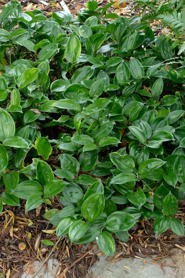 Disporopsis arisanensis BSWJ1864 is a 1993 Crug Farm collection of the evergreen Solomon's Seal from 5,100' elevation near Taipingshan, Taiwan. Disporopsis are rather confused taxonomically, but having a plant propagated from an original wild collection makes sure you have the correct item. Our 8-year old clump has produced a solid 4' wide patch of 1' tall stalks, each adorned by four thick, round evergreen leaves (2.25" wide x 3.25" long), alternately-arranged at the upper reaches of the stem. The axillary small fragrant white flowers in mid-spring are heavily flecked brown. These are followed by fleshy dark purple fruit that persists until spring. Disporopsis arisanensis performs great in average woodland conditions.