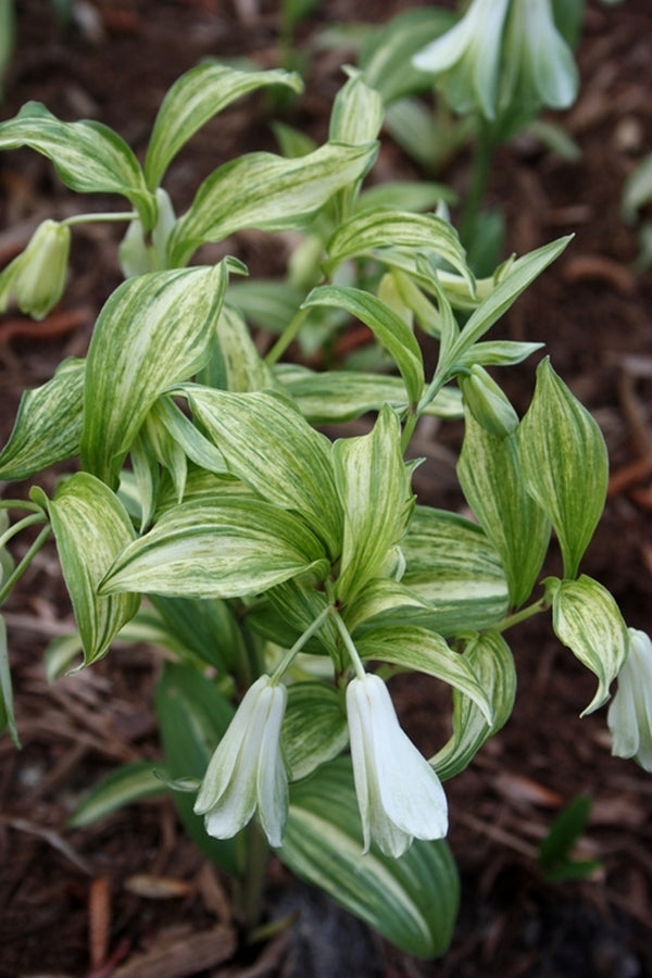 (aka: Disporum 'Sunray') Disporum 'Kinga' is a Japanese selection of the stoloniferous groundcover Disporum sessile, although it's much slower spreading than the white-edged form. The 15" tall, deciduous stalks arise in mid-spring, clothed with 4" long x 1.5" wide green leaves heavily streaked in creamy yellow. The streaking changes to white by late spring and often merges to appear as a solid white leaf center. In mid-April (NC) the stalks are adorned with small white bells. Disporum 'Kinga' is perfect in a woodland garden or Nevada brothel...anywhere a little uncontrolled wandering is permissible.