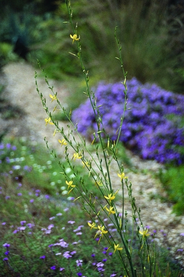 This delightful lily relative is from our 1994 Mexican expedition, collected at 2,400' in elevation in the Sierra Chiquita Mountains. The 1' long x 1" wide basal foliage resembles a spider plant. In August, a spike begins to rise from the basal rosette, topping out in October at 4' tall. Along the top 3' of the stalk hang delightful golden-yellow dodecatheon-like, star-shaped flowers. For over 20 years, this has been a star in our fall garden. We have been surprised how well it has performed in light shade/part sun. The key seems to be well-drained soil.