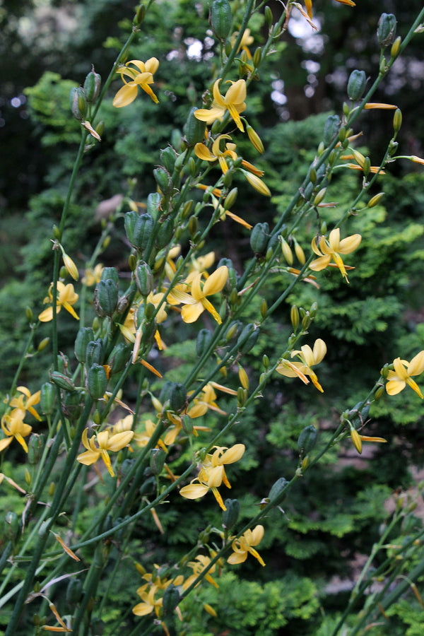By all rights, this rare Southeast US native Echeandia texensis shouldn't be winter-hardy for us, but here is a great lesson why we trial plants. This stunning fall bloomer hails from the summit of Loma del Potrero Cercado, east of Brownsville, Texas (Zone 9A) at the whopping elevation of 26' . Despite this upbringing, it has taken all the winter cold we can throw at it without blinking. The deciduous 3' wide spider plant-like green rosette returns in spring, and in September and October is topped with 5' tall branched spikes of small star-like, mustard-yellow flowers...superb for color in the fall garden!