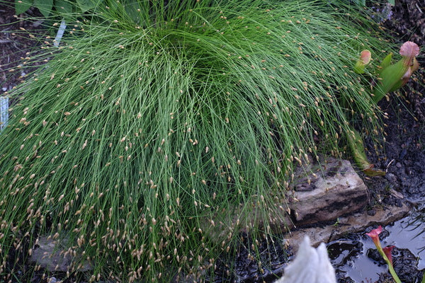 Eleocharis tuberculosa 'Maple Hill' is our 2013 collection from near Maple Hill, in North Carolina's coastal Pender County. Native from coastal Maine and south to Texas, Eleocharis tuberculosa is found in moist, boggy soils. The elegant, evergreen clumps resemble a very fine-textured carex, each forming a 3.5' wide x 10" tall specimen. At the tip of each leaf, you find the "flower"...a tiny, dangling brown pine cone-looking structure. We grow our cone-cup spike rush in a pitcher plant bog, where it's happy as the proverbial clam.