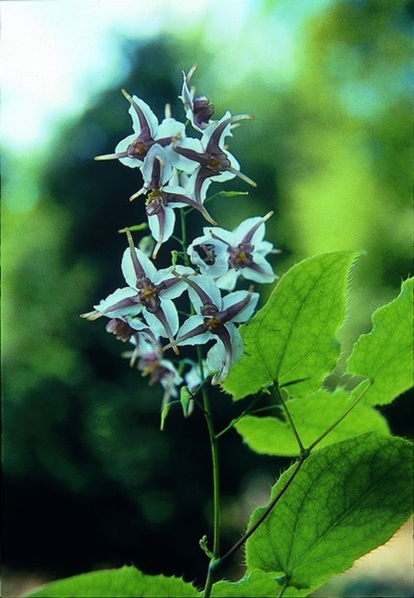 This new, recently published species (1997) was discovered by the Beijing Botanic Garden and sent to Darrell Probst for identification. Darrell in turn asked the UK epimedium guru, the late Dr. William Stearn, to name the plant in honor of the late Harold Epstein. This splendid vigorous evergreen species makes a nice dense groundcover, spreading at the rate of 8" per year. The glossy foliage provides a nice foil to the stunning bicolor flowers (up to 30 per stalk)...large white spurs with a wine-purple central cup. This is a stunning new plant everyone is asking about!