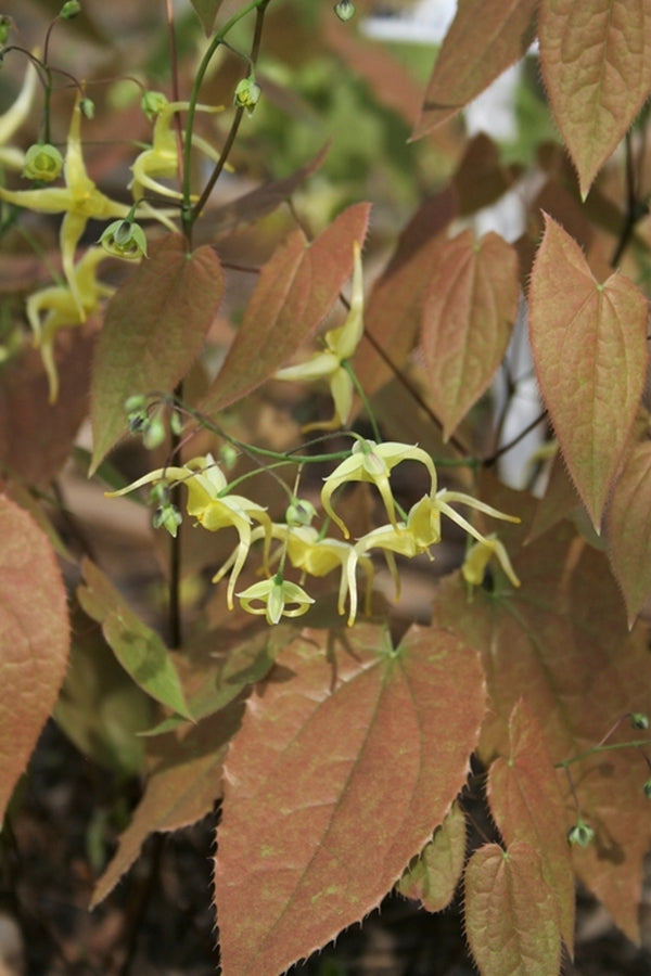 Epimedium franchetii 'Suntan' is a 2016 Plant Delights introduction...a selection of the Chinese fairy wing, whose early spring foliage emerges dark raspberry before maturing to bronze, and later to green. Epimedium franchetii 'Suntan' is topped in early spring with upright stalks of large, butter-yellow, spider-like flowers...a superb contrast against the bronze foliage. Although evergreen in our climate, we recommend removing the old foliage in late winter for a better show of the amazingly colored spring foliage.