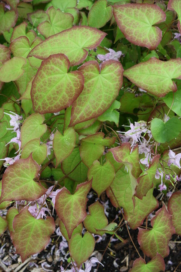 Epimedium 'Lilac Cascade' is a 2001 Darrell Probst introduction, a cross of Epimedium sempervirens 'Candy Hearts' x Epimedium grandiflorum 'Yubae'. The semi-evergreen, heart-shaped foliage of Epimedium 'Lilac Cascade' re-emerges in spring flushed with lilac, which soon morphs to a reddish leaf edge that disappears with spring warmth. The stalks of cascading mauvy-lavender flowers top the clump starting in mid-March (NC).