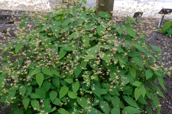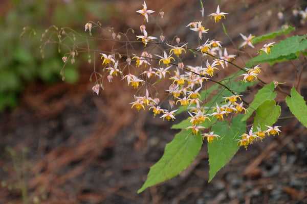 This 2009 Plant Delights/JLBG introductions is an Epimedium sagittatum hybrid that's been a favorite for years in our garden. Epimedium 'Mini Pearl' makes a tight deer-resistant clump topped, starting in very early March and continuing until mid-June (NC), with 2' spikes of tiny pink buds which open to small white flowers, each highlighted by a yellow cup. Epimedium 'Mini Pearl' produces the same cloud-like effect of Epimedium sagittatum.