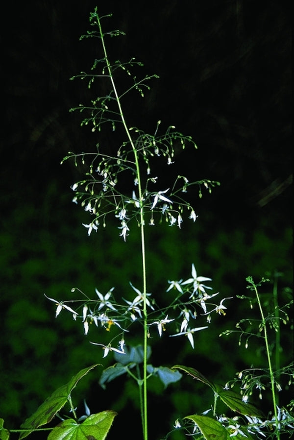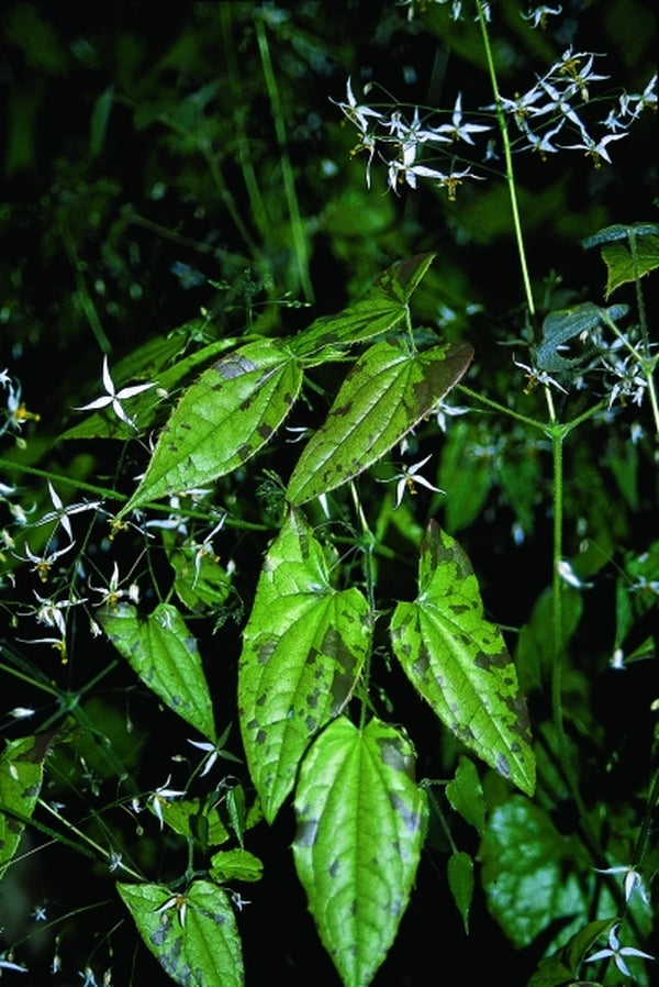This tall-growing Chinese species is adorned with fairly large, evergreen foliage, emerging from a tight, clump-forming rhizome. The tiny white-and-yellow bicolor flowers are produced in mass on stalks held well above the foliage. Despite the small flower size, this is truly an exciting evergreen addition to the woodland garden. In our trials of over 150 different epimediums, E. pubescens has the best-looking residual evergreen foliage in springtime.
