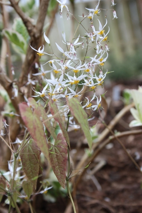 We are pleased to introduce Epimedium pubescens 'Snowflakes'...a running form of the typically clumping Epimedium pubescens. Epimedium 'Snowflakes' makes a 6" tall x 3' wide patch of evergreen foliage, topped, starting in mid-March, with spikes of dainty white flowers held 6" above the foliage...charming!
