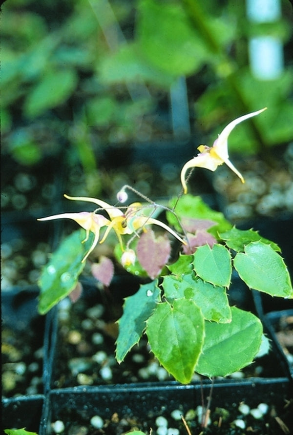 This recently described species (1998), from Yunnan and Sichuan Provinces in China, forms a mass of small, spiny-looking evergreen foliage...often red-mottled in spring. The clumps spread by runners at the rate of 6-8" per year. This unusual summer-flowering epimedium begins blooming in late May and continues for 1-2 months. Each 18" to 24" flower scape is draped with large 2" light yellow flowers, with up to 50 flowers per stalk. This is, without question, the most floriferous epimedium that we grow.