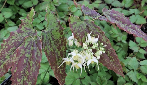 Epimedium wushanense 'Super Mottle' is a 2016 Plant Delights Nursery introduction of our selection of the impressive Chinese native fairy wing, which we selected and named in 2009. The 7" long x 2" wide, spiny evergreen leaves are deliciously mottled raspberry and green in spring. In late April (NC), the 20" tall x 2' wide clumps are topped with terminal spikes, each bearing dense clusters of up to 50 large, creamy flowers.