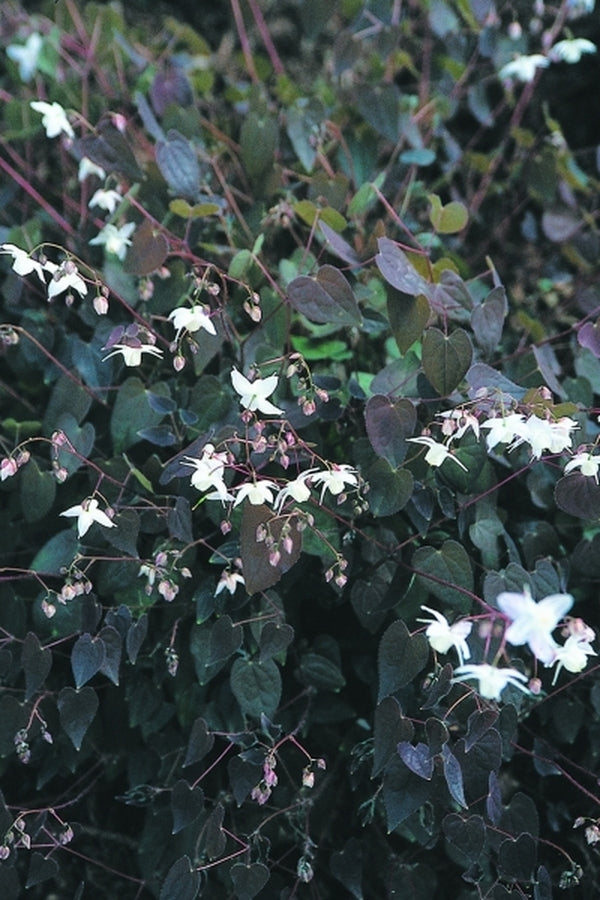 Epimedium x youngianum 'Purple Heart' is a 2000 Darrell Probst introduction from his cross of E. grandiflorum var. violaceum and E. x youngianum 'Pink Star'. The purple-tinged leaflets become darker as they mature, providing a stunning backdrop for the near-white flowers. While the leaves on this tight clumper eventually turn green as the weather warms, they once again take on the purple color as fall arrives.