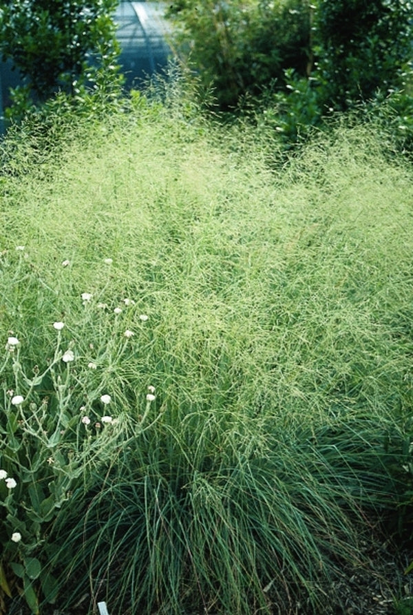 Mea Culpa. When I first found this exciting grass on a dry hillside in southern Georgia, I was able to collect a tiny division. I grew it out and subsequently sent it off to a grass taxonomist for identification. As it turns out, his identification of the US native E. elliottii was incorrect and, in fact, it is the South African E. chloromelas. Planted in our garden, E. chloromelas makes a 3' wide clump of narrow, powder-blue foliage. In early May, the airy but sturdy plumes arise to 3', opening like a giant tan cloud. In October, the plumes remain as nice as when they first opened...superb as a specimen or as a border subject!