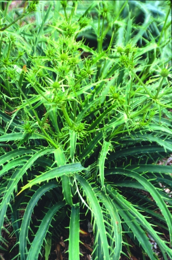 This Yucca Do collection T73-87 hails from the pine-oak forested mountains around the Queretaro town of La Canada at 8,120' elevation. Since we planted our first plants in 2000, this still unidentified eryngium has become one of our favorites in the genus. Each 1' tall x 2' wide clump is composed of flat, glaucous, heavily-armed leaves with a striped silver underside...we peeked. In late June, the architectural clump is topped by 2' tall branched spikes of small spiny green flowers. This has been one of the best performing and longest lived eryngiums we have grown.