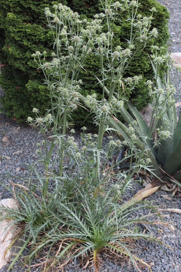 Eryngium venustum is a rarely offered species, collected many years ago in the Mexican mountains (coll #50-18) by our friends at the former Yucca Do Nursery. Eryngium venustum has been very well-behaved in our sunny rock garden for over 20 years. This small growing, but architecturally stunning, drought-loving eryngium is armed to the "teeth" with silver spines on the sides of each waxy green leaf, and a double row of spines down the top...heck, it probably has spines on the roots! The 18" flower stalks top the clumps...great in the anti-social part of your garden. What a great passive-aggressive gift for the boss who is so deserving.