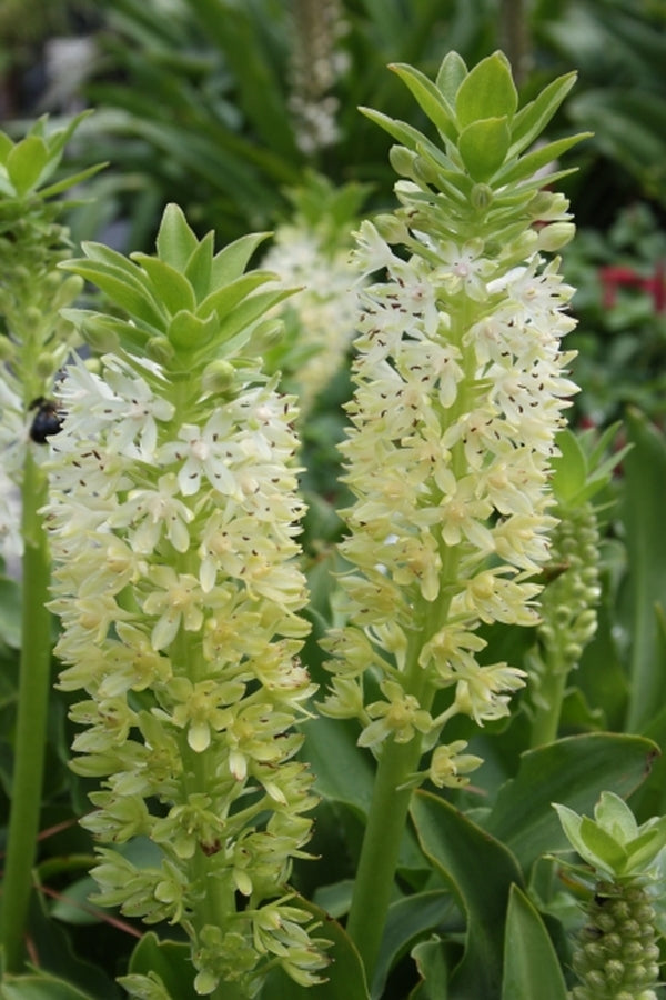 This new Eucomis comosa hybrid was bred by the Dutch company, A. Langedijk. The rosettes of 2' long, strap-shaped, green leaves are topped, starting in early July, with 3' tall spikes of creamy white flowers highlighted by pink centers...worthy of its name. Although Eucomis 'Kilimanjaro' is often listed as a selection of Eucomis comosa, its height indicates a more probable hybrid of Eucomis comosa and Eucomis pallidiflora (pole-evansii).