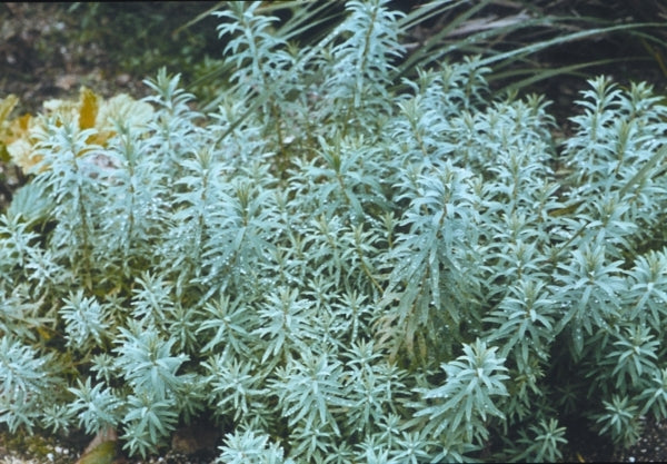 This amazing new hybrid between the upright Euphorbia seguieriana ssp. niciana x the prostrate blue-foliaged Eastern European E. nicaeensis, makes a dazzling 2' wide clump. The narrow powder-blue foliage contrasts nicely against the red stems. The 15-18" tall compact mound is topped in late spring with 18" spikes of chartreuse-yellow flowers...very unique and very striking.