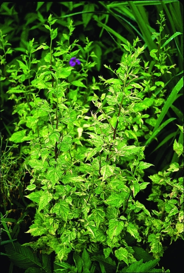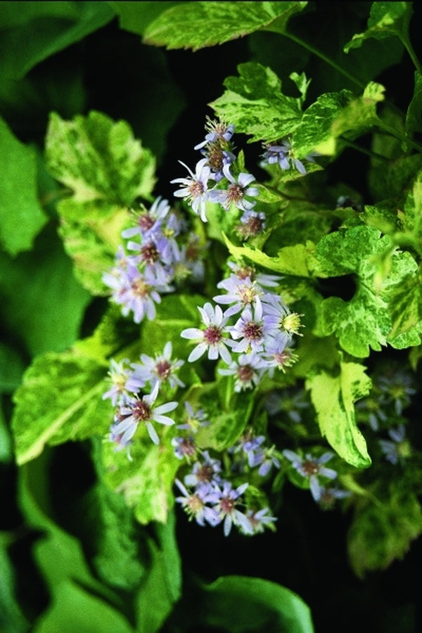 (syn: Eurybia divaricata) This quirky little attention-getter has drawn an amazing amount of ooohs and whatzats in our display gardens. Selected by Hans Hansen from his home garden in Waseca, Minnesota, this small native aster forms a 10" wide basal rosette of heart-shaped leaves. Each leaf is heavily streaked with a dramatic white confetti-like pattern. In late spring, the flowering stalks rise to 2' tall, topped in early summer with small light lavender flowers.
