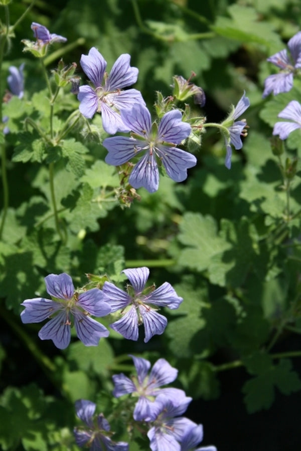 Geranium 'Stephanie' arose at the Royal Botanic Garden Edinburgh from seed sent by the Cambridge University Botanic Garden as Geranium peloponnesiacum. It was recognized that this seedling was, in fact, a hybrid between the Greek Geranium peloponnesiacum and the alpine Caucasican species Geranium renardii. The result was Geranium 'Stephanie' which forms a 14" tall x 18" wide tight clump of textured, light green, rounded foliage, topped in April and May with upturned, light mauvy blue (RHS 85A/B) flowers, highlighted by dark purple veins that radiate out from the center...a heavy spring bloomer and a stellar performer in our heat and humidity!