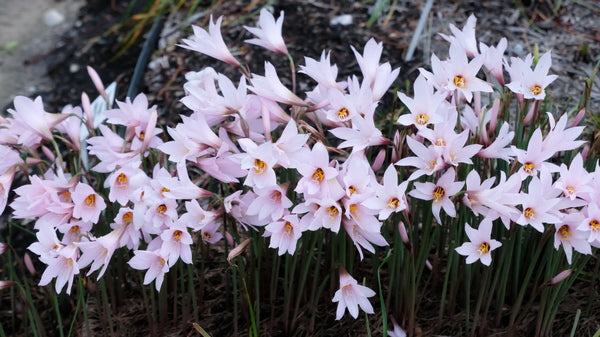 Habranthus martinezii 'Mini-Cherry' is a strain of the Northern Argentinian rain lily, Habranthus martinezii. The vigorous, compact, 8" clumps offset nicely, and begin their flowering season as early as mid-May in NC, and continue into September, after each rain, with large, light peachy pink horizontal-facing solitary cups with dark purple bases. Although Habranthus martinezii, named in honor of entomologist Antonio Martinez, was only discovered in 1970, it didn't take long to make a splash on the horticultural scene, quickly earning the prestigious Royal Horticultural Society Award of Merit. The drought tolerant Habranthus martinezii 'Mini-Cherry' has been a great performer both in pots and in the garden. Each pot has multiple flowering-sized bulbs. It will seed around nearby the original clump, so keep this in mind when siting your plant.