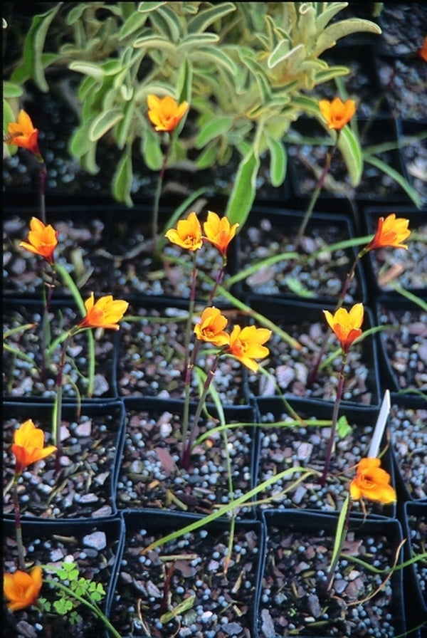 Thriving on neglect, this cute little bulb from our Southwest US neighbors is one for those who manage to kill everything. Soon after summer rains, this small clump of narrow, flattened, glossy green foliage gives rise to 8" stalks ending in nickel sized, yellow orange flowers. The inside of the flower is highlighted by a dramatic brown throat, while the outside is netted with copper veins giving the coppery appearance to the flower...incredibly cute in a mass planting...great for making color combinations that will make your neighbors want to leave town!