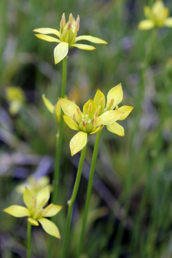 We are pleased to introduce one of the rarest southeast native plants, the Federally Endangered Harperocallis flava. Harperocallis flava, a member of the Tofieldiaceae family, only occurs in a few populations in the Apalachicola region of the Florida Panhandle, where it is becoming scarcer, primarily due to fire suppression. Our offering is propagated from leftover research plants provided by the USFWS to the SC Botanical Gardens. We find Harperocallis flava quite easy to grow with sarracenias in an acidic sand/peat bog garden. Harper's Beauty forms tight 5" tall tufts of narrow, upright, grass-like foliage, topped in April and May with 18" tall stalks, ending in small, bright yellow, 6-petalled, star-shaped flowers. We are unable to ship these outside of North Carolina due to regulations designed to keep endangered plants rare and out of the hands of gardeners.