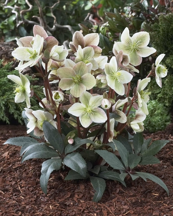 (aka: Helleborus HGP02) Helleborus 'Winter Sunshine' is a 2007 introduction from England's Harveys Garden Plants. This Helleborus niger x sternii hybrid forms a 12" tall x 18" wide evergreen clump of dark pewter green foliage. The clumps are topped in late winter with stalks of outfacing flowers, white on the outside and pink on the back. Plant in well-drained soils, keep it out of deep shade, and you'll have a superb deer-resistant garden specimen.