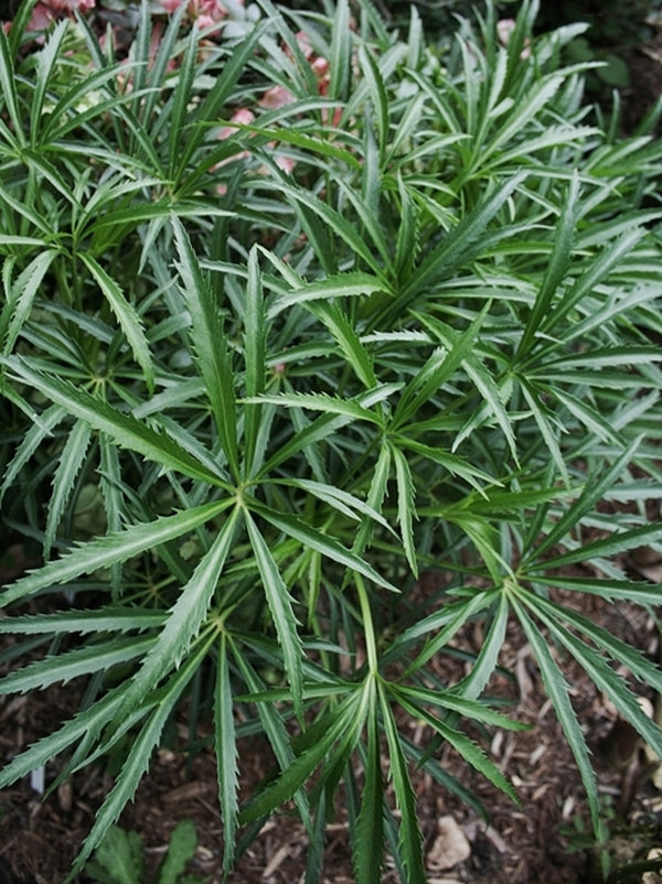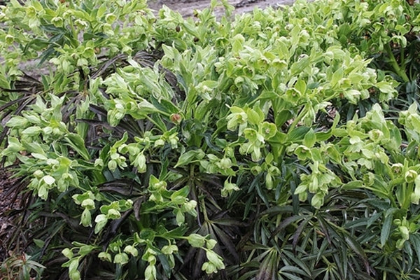 Helleborus foetidus 'Leather and Lace' started at Plant Delights Nursery as a couple of oddball seedlings we pulled out of our Helleborus foetidus 'Krenitsky' strain, and subsequently introduced as a strain in 2015. The dark, black-green foliage of what we subsequently named Helleborus 'Leather and Lace' is more deeply cut than any form of Helleborus foetidus we've ever grown. The 20" tall x 3' wide evergreen clumps are topped with the typical 10" tall candelabra-like terminal sprays of large green bells in winter. As with all Helleborus foetidus, well-draining soils is the key to success.