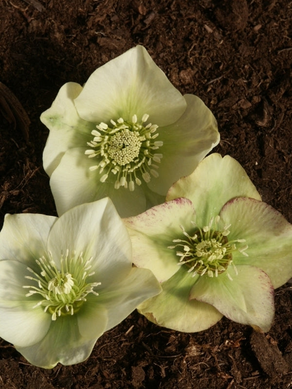 These deer-resistant Heronswood hybrids have flowers of creamy white...not quite white and not quite yellow. Some have a small bit of pink veining as well.
