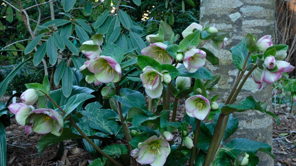 Helleborus 'Glenda's Gloss' is another recent selection of the sterile hybrid lenten roses, deriving from a cross of Helleborus niger, lividus, and Helleborus x hybridus. The 15" tall x 2' wide evergreen clumps are clothed with glorious dark green foliage, marbled with prominent silver veining. Starting for us in mid-February, the clumps are topped with an abundance of spikes of white, out-facing flowers, blushed pink on the backs, creating a lovely bicolor effect in the garden.