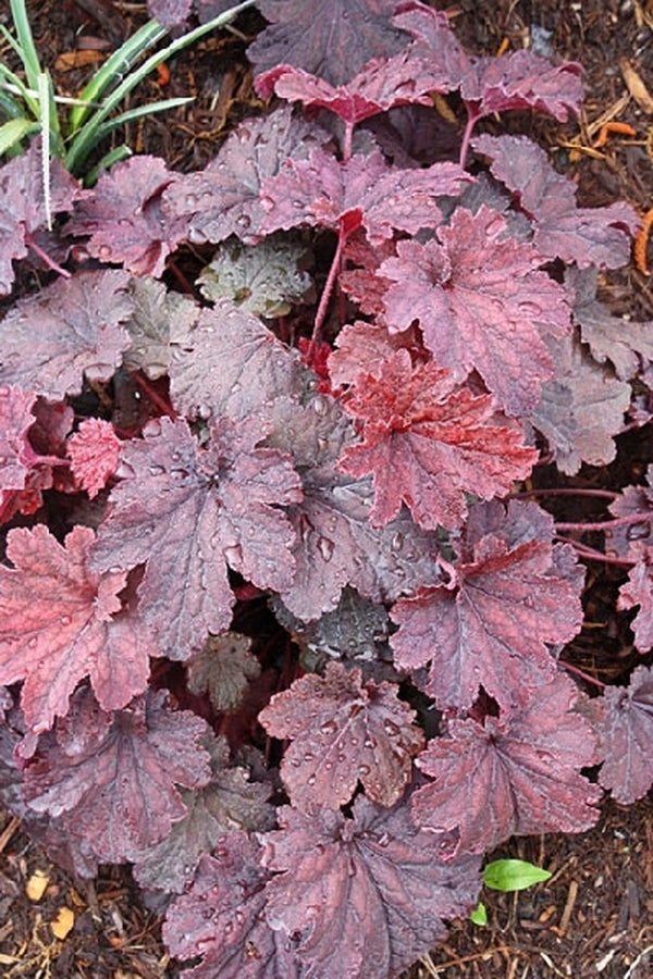Heuchera 'Cajun Fire' has been incredible in our trials...even when planted in full sun, which few coral bells can tolerate. For us, Heuchera 'Cajun Fire' forms a 1' tall x 2' wide mound of cinnamon-purple foliage that takes on a unique reddish hue in cold weather. In spring the new foliage emerges fiery red and in June (NC) the clumps are topped with 18" spikes of tiny white flowers. We love making fun Mardi Gras color combinations in the garden with Cajun Fire coral bells.