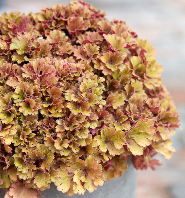 Heuchera 'Frilly' is a unique sport of RHS Award of Garden Merit-winning Heuchera 'Tangerine Wave', discovered by Welch nurseryman Neil Alcock. The 1' tall x 20" wide clumps of ridiculously wavy leaves, are rich, tangerine-color during the growing season and transition to burgundy in cool weather. In spring, the clumps of this amazing Heuchera villosa hybrid are topped with spikes of small creamy flowers.