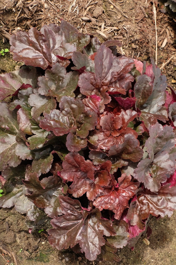 Heuchera 'Mahogany Monster', from the Walters Gardens breeding program is another in the long needed series of giant coral bells. The 15" tall x 30" wide, heat tolerant clump is clothed in mahogany colored, nicely ruffled, evergreen leaves. In mid-spring, the clumps are topped with 32" spikes of pink buds that open white.