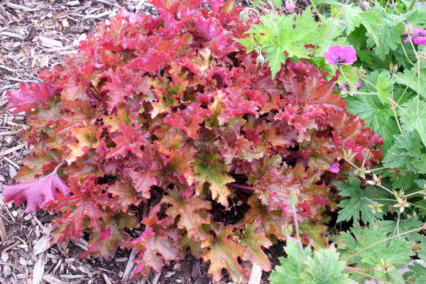 Heuchera 'Zipper' is prized for its caramel orange evergreen, exquisitely-textured foliage, which adds winter interest to the woodland gardens.