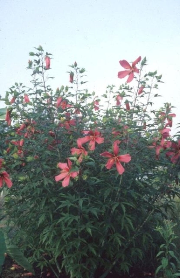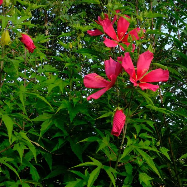 Hibiscus 'Red Flyer' is a 2002 Plant Delights/JLBG introduction of a hybrid of two US natives, Hibiscus coccineus x Hibiscus grandiflorus. This monster plant has sturdy stalks that towers to 12' in height, clothed with marijuana-like foliage, which comes from Hibiscus coccineus parent. Its sawfly resistance comes from Hibiscus grandiflorus. The hybrid vigor came from really good sex. For us, Hibiscus 'Red Flyer' starts flowering in mid-July and continues until frost...attractive to hummingbirds. Plenty of nutrition and moisture will produce the best results. Hibiscus 'Red Flyer' is almost completely sterile, so don't expect any new dependents showing up.
