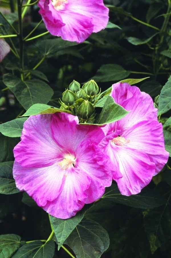 This 1997 Fleming hybrid makes a 3' tall deciduous clump of upright stems clothed in dark purple leaves. The clumps are adorned, starting in midsummer and continuing until early fall, with large, 8" fluorescent pink flowers, each with a contrasting red eye...sounds frighteningly like when I looked in the mirror after election night. Moist soils are best, but Hibiscus 'Royal Gems' is quite drought-tolerant.