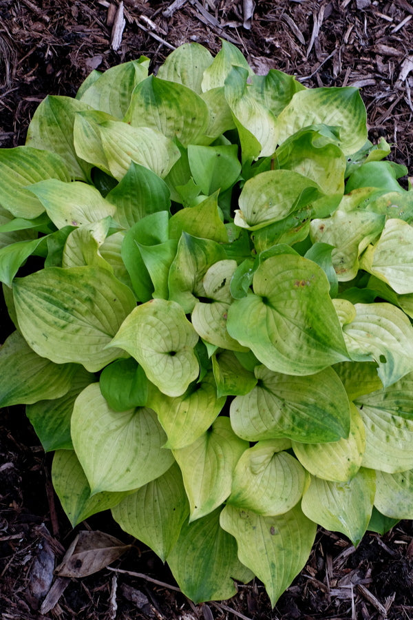 We are pleased to share our 2007 seedling selection from a cross of Hosta 'Faith' with another hosta whose parentage includes H. sieboldiana, H. kikutii, H. pulchella, H. longipes, H. nakaiana, and H. venusta. Our effort to produce a dwarf, fast-growing, Hosta sieboldiana-like plant, resulted in this 2019 introduction, a delightfully unique 7" tall x 20" wide hosta with thick, round, nicely pebbled leaves that emerge in spring with chartreuse-green, glossy foliage. As the growing season progresses, the foliage brightens to a luminescent white gold. Another unique trait we love is that every fold of the leaf turns a different shade of green/gold...quite unique.