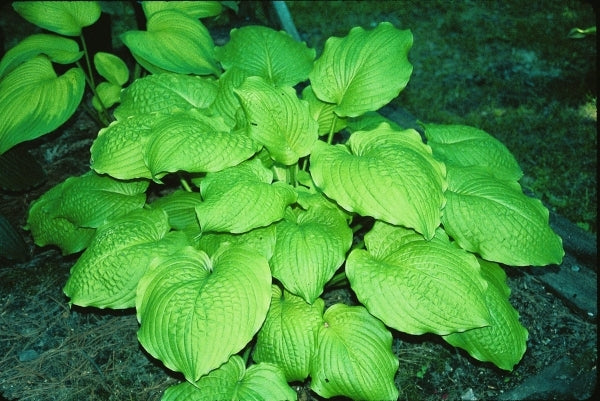 This new introduction from Olga Petryszyn makes a fast-growing, 3' wide mound of corrugated foliage, brilliant gold in spring, changing to a chartreuse color by summer. Essentially, this is a "Golden Tokudama" that grows quickly and does not scorch. In early summer, the clumps are topped with 30" scapes of light lavender flowers.