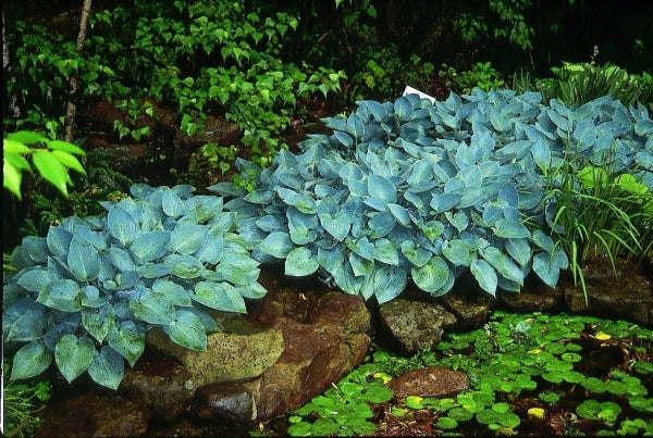 Hosta 'Halcyon' is one of the most recognized and most popular hostas in the history of the genus. This 3' wide clump of round blue leaves (pointed when young) is recognized as one of the all-time finest blue hostas. Hosta 'Halcyon' holds its color well, is a vigorous grower, has good substance, is durable, and just like your Timex watch, it takes a lickin' and...you know the rest! The clump is topped with lots of blue-lavender flowers in summer.