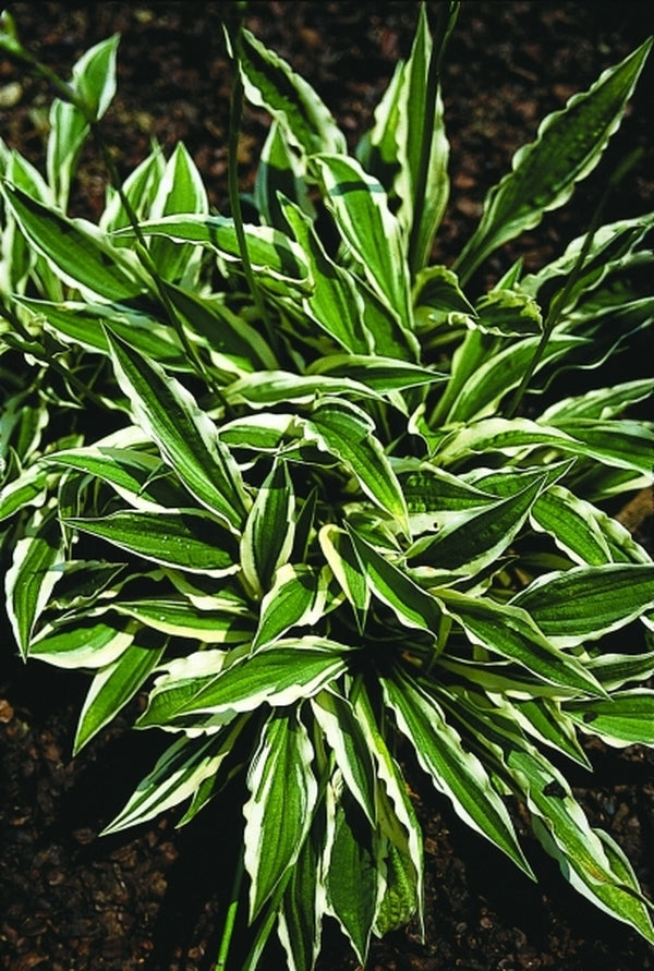 This delightful new hosta (an H. 'Ginko Craig' sport) from Walters Gardens makes a cute 2' wide mound of narrow, light green foliage with a very ruffled, wide white border. In late summer, the clumps are topped with 2' tall scapes of dark lavender flowers. This is a great border hosta for the woodland garden.